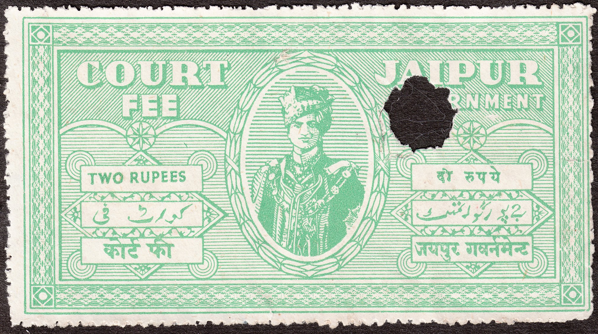 Diese Gebührenmarke "COURT FEE" aus Jaipur in Type 10 zu 2 Rupien zeigt Maharadscha Sir Sawai Man Singhji Bahadur:
