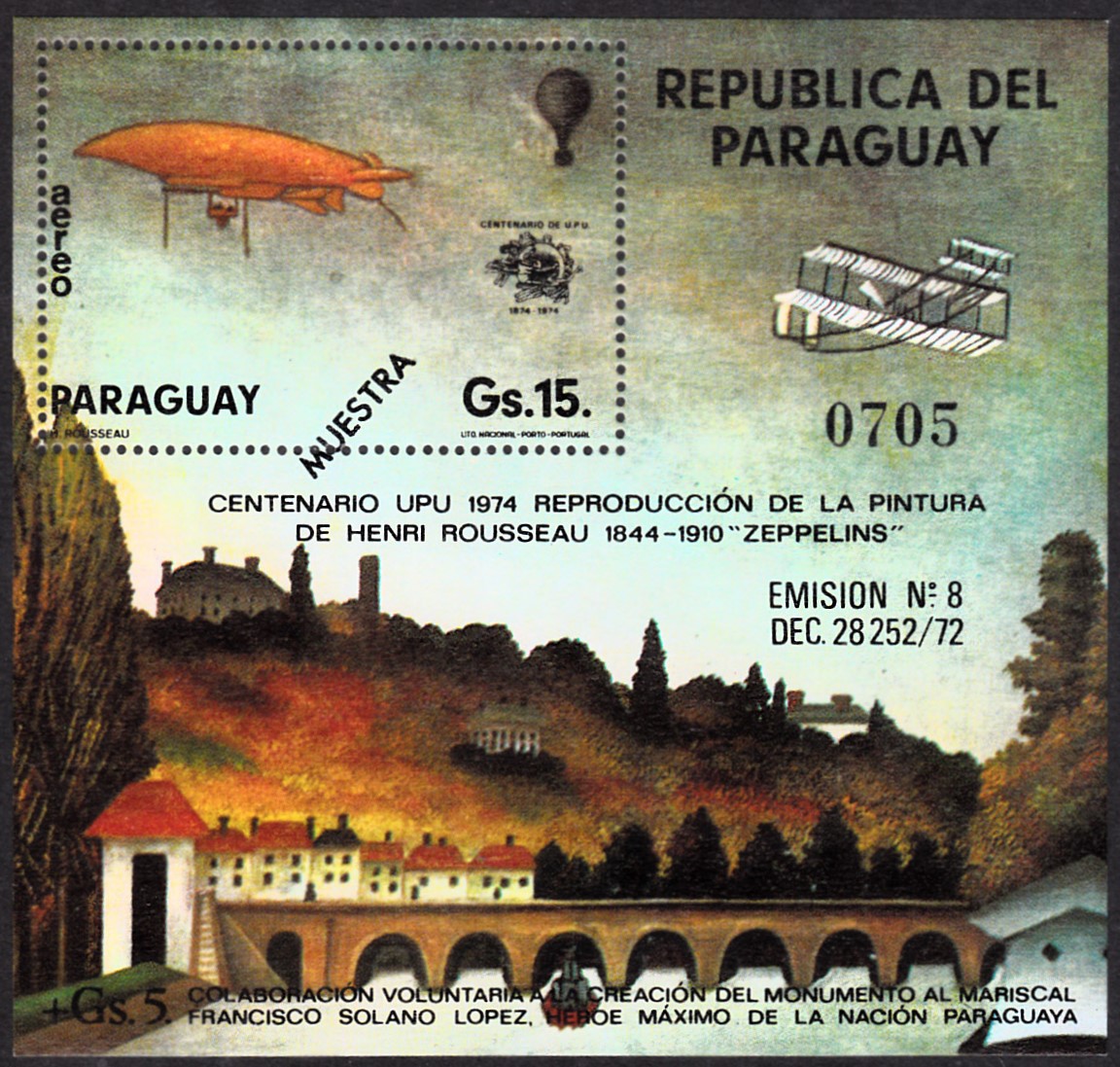 In Paraguay ist ein Block (MiNr 229) erschienen, der ein Gemälde von Henri Rousseau (1844-1910, französischer Maler) zeigt, das eine südfranzösische Landschaft mit einem Doppeldeckerflugzeug, einen Ballon und das Luftschiff "Patrie" zeigt. Hier kann ich einen Block mit dem Aufdruck "Muestra" zeigen.