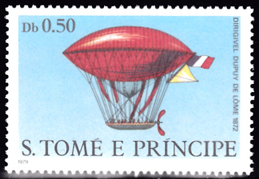 Auf dieser Marke aus Sao Tomé und Principe (MiNr 626) zeigt das Luftschiff von Dupuy de Lôme aus dem Jahre 1872.