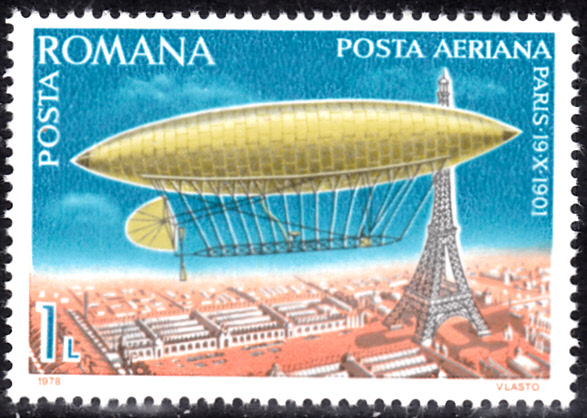 Auf dieser Marke aus Rumänien (MiNr 3500) wird das Luftschiff Nr 6 von Alberto Santos Dumont über dem Eiffelturm gezeigt. Mit der "Santos Dumont Nr. 6" gelang ihm im dritten Versuch am 19. Oktober 1901 der erste erfolgreiche Rundflug eines Luftschiffes vom Pariser Vorort Saint-Cloud zum Eiffelturm über 5,5 Kilometer in 30 Minuten. Damit gewann er den Deutsch-Preis in Höhe von 100 000 Franc. Der Deutsch-Preis ist ein Luftfahrtpreis für "Luftfahrzeuge leichter als Luft" (Luftschiffe), der im April 1900 vom Öl-Industriellen Henry Deutsch de la Meurthe gestiftet wurde. Die 100.000 Franc Preisgeld stiftete er den Arbeitern und Bettlern von Paris.