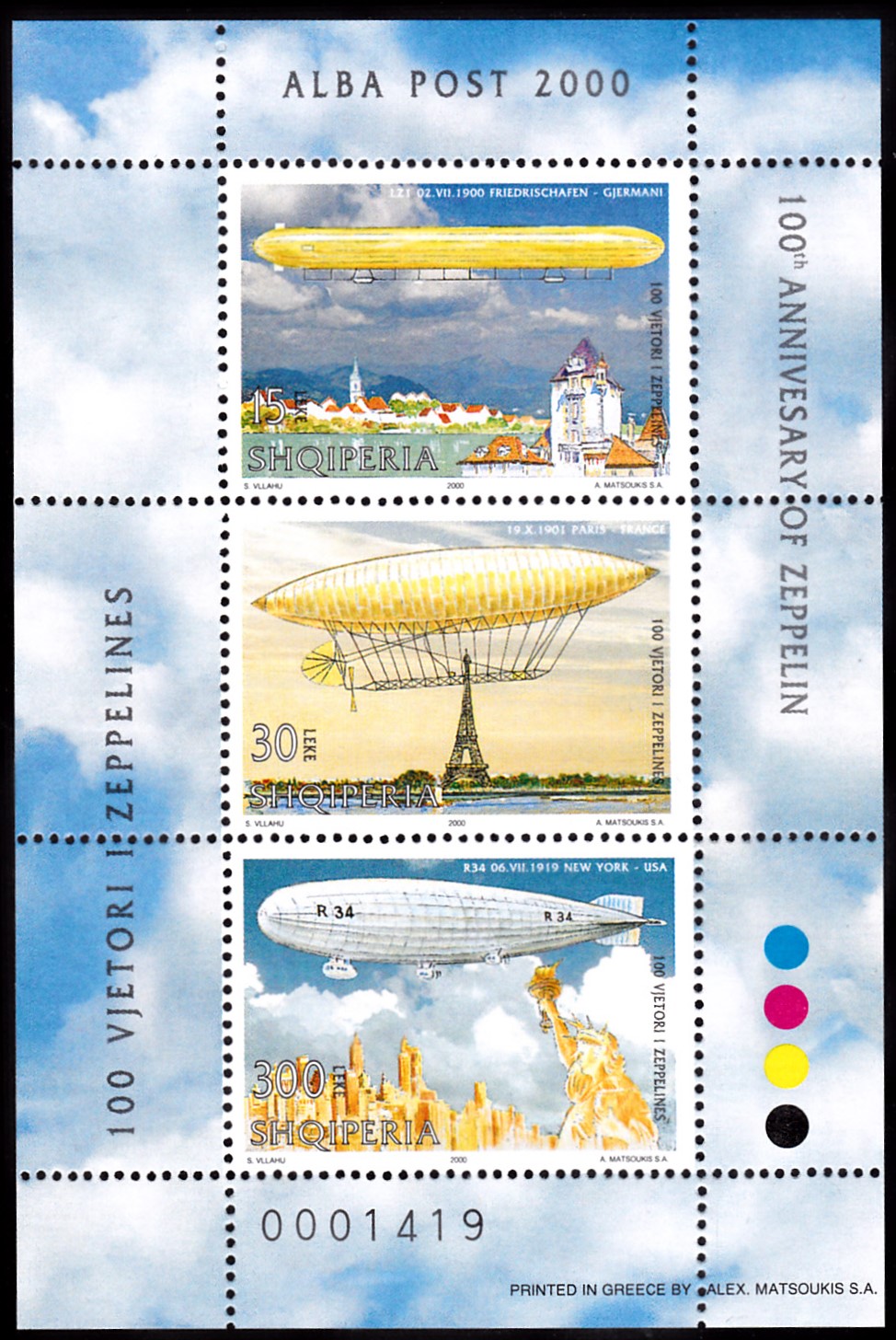 Auf dieser Marke aus Rumänien (MiNr 3500) wird das Luftschiff Nr 6 von Alberto Santos Dumont über dem Eiffelturm gezeigt. Mit der "Santos Dumont Nr. 6" gelang ihm im dritten Versuch am 19. Oktober 1901 der erste erfolgreiche Rundflug eines Luftschiffes vom Pariser Vorort Saint-Cloud zum Eiffelturm über 5,5 Kilometer in 30 Minuten. Damit gewann er den Deutsch-Preis in Höhe von 100 000 Franc. Der Deutsch-Preis ist ein Luftfahrtpreis für "Luftfahrzeuge leichter als Luft" (Luftschiffe), der im April 1900 vom Öl-Industriellen Henry Deutsch de la Meurthe gestiftet wurde. Die 100.000 Franc Preisgeld stiftete er den Arbeitern und Bettlern von Paris.