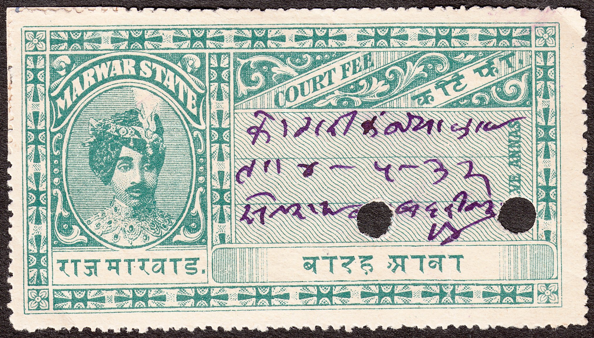 Diese Gebührenmarke "COURT FEE" in Type 6 zu 12 Annas zeigt als Motiv Maharadscha Umed Singh: