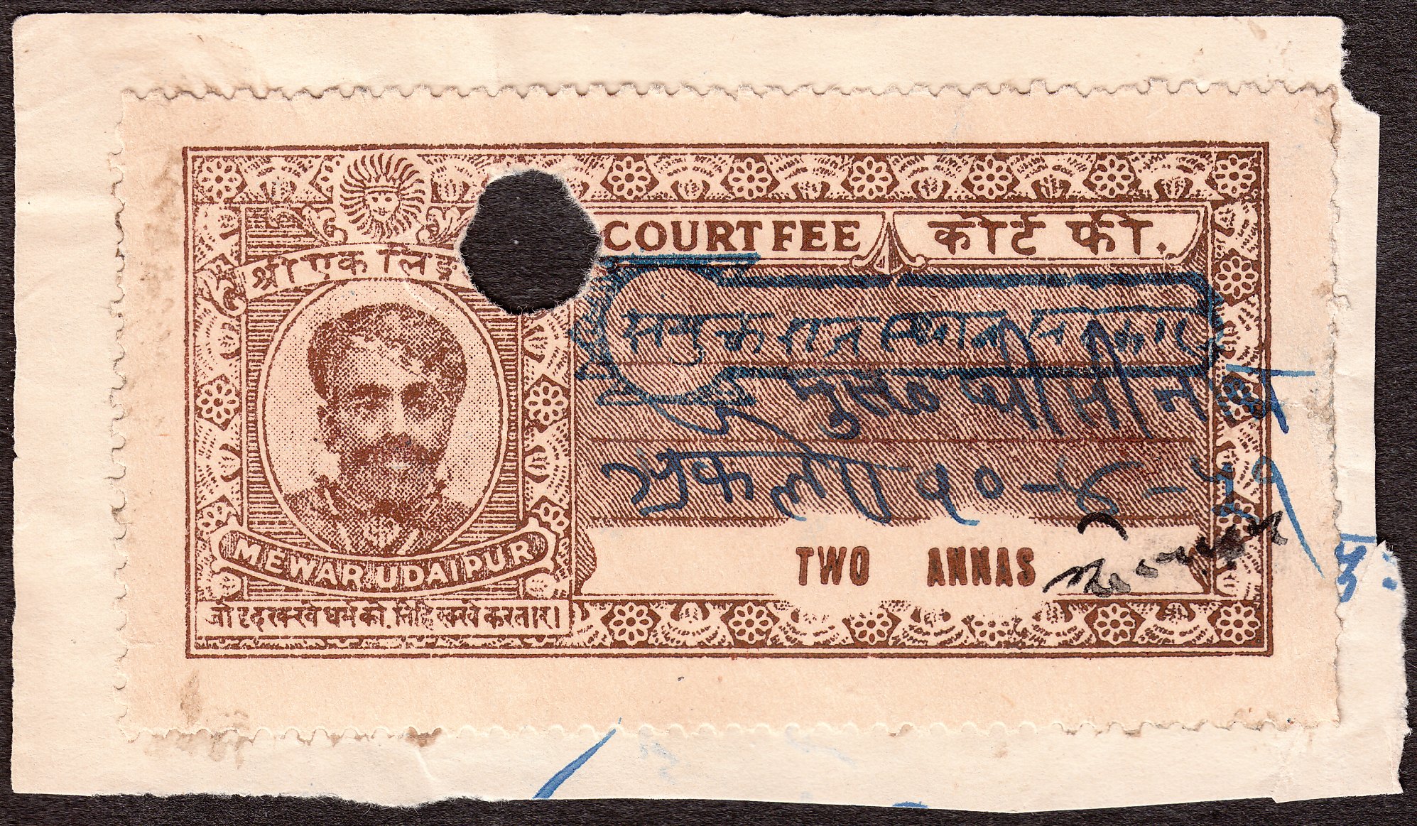 Diese Gebührenmarke "COURT FEE" zu 2 Annas aus Mewar in Type 20 zeigt Lt. Col. H.H. Maharajadhiraja Maharana Sir Bhupal Singh Bahadur und wurde katalogisiert als KM 202a: