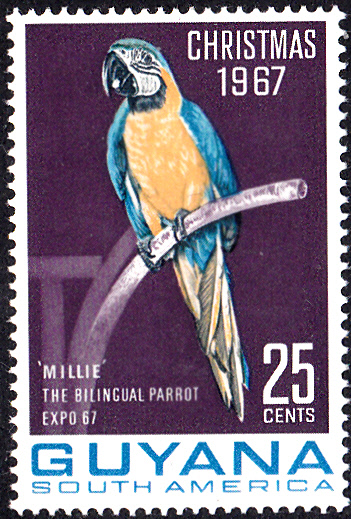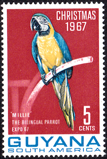 Diese am 6.11.1967 als Weihnachtsmarken 1967 in Guyana erschienenen Marken zeigen den Gelbbrustara (Ara ararauna) "Millie", ein zwei Sprachen sprechender Papagei, der als Attraktion im Guyana-Pavillon der Weltausstellung "Expo 67" in Montreal zu bewundern war.