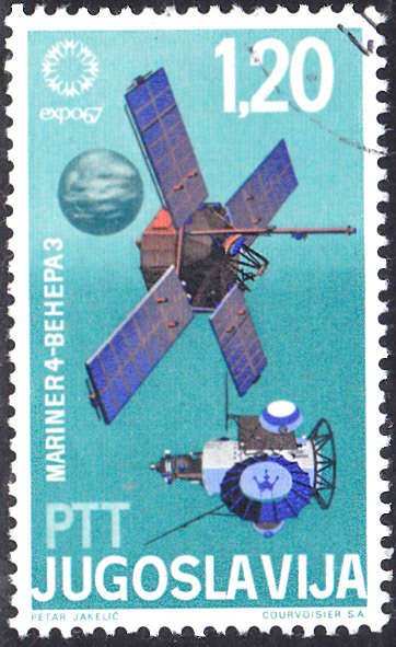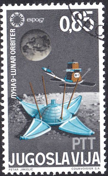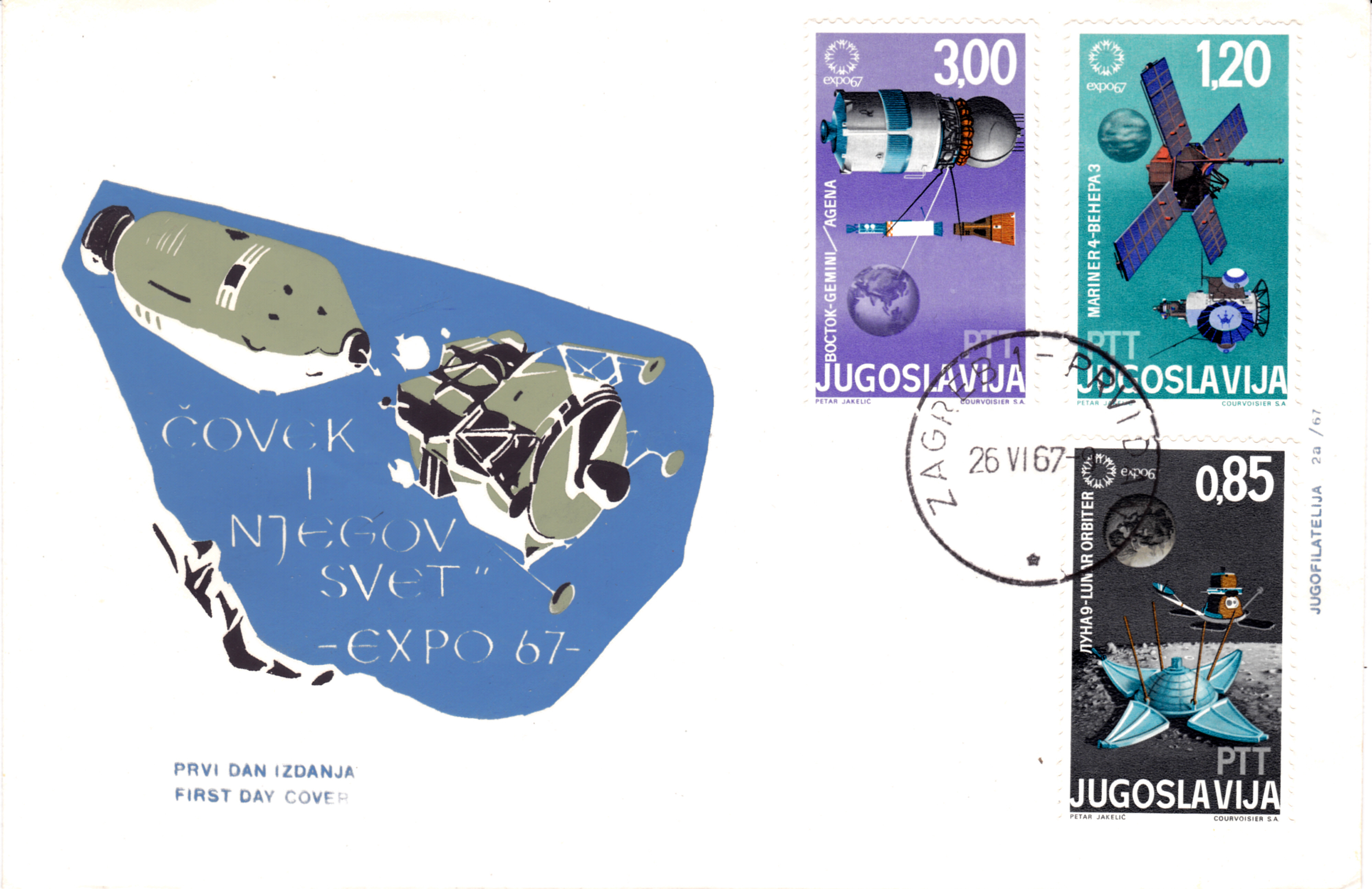 Jugoslawien nahm mit einem Pavillon an der Expo 67 teil. Eine Marke aus der Serie aus Jugoslawien (MiNr 1216) zur Weltausstellung EXPO ’67 im Montreal; und zum 18. IFA-Kongress in Belgrad zeigt im Markenbild Sputnik 1 (oben) und Explorer 1 (unten).