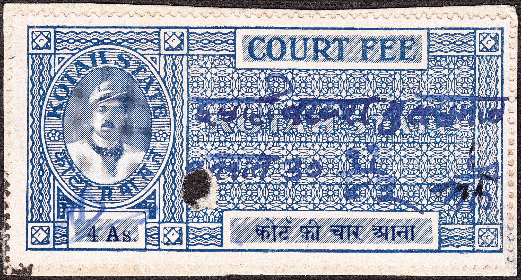 Diese Gebührenmarke "COURT FEE" in Type 30 zu 4 Annas in blau zeigt als Motiv Maharao Kumar Bhim Singh Bahadur:
