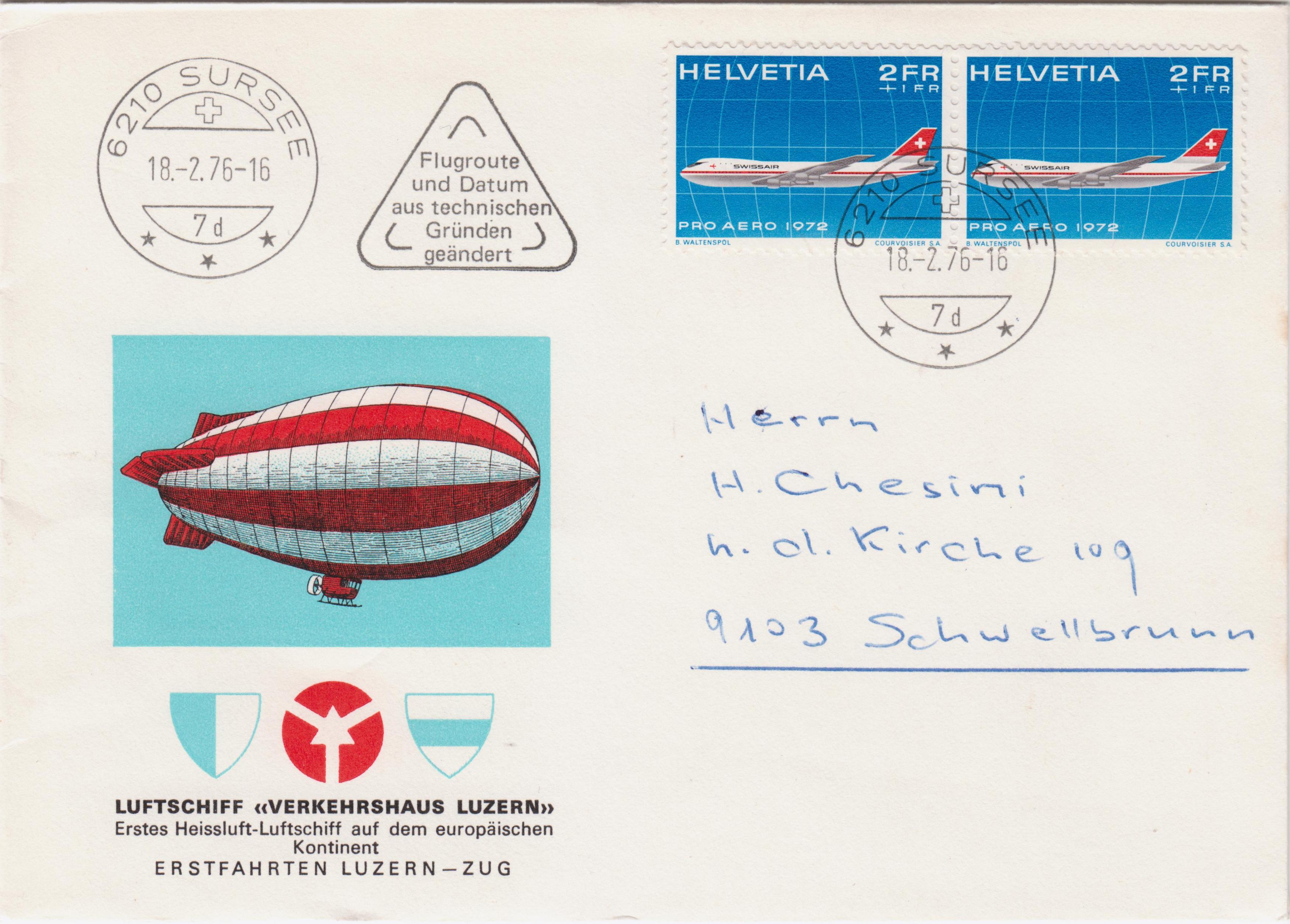 Ursprünglich sollte die mit dem hier gezeigten Beleg dokumentierte Fahrt von Zug nach Luzern führen, auf die Änderung der ''Flugroute'' weist ein dreieckiger Stempel in Schwarz hin.