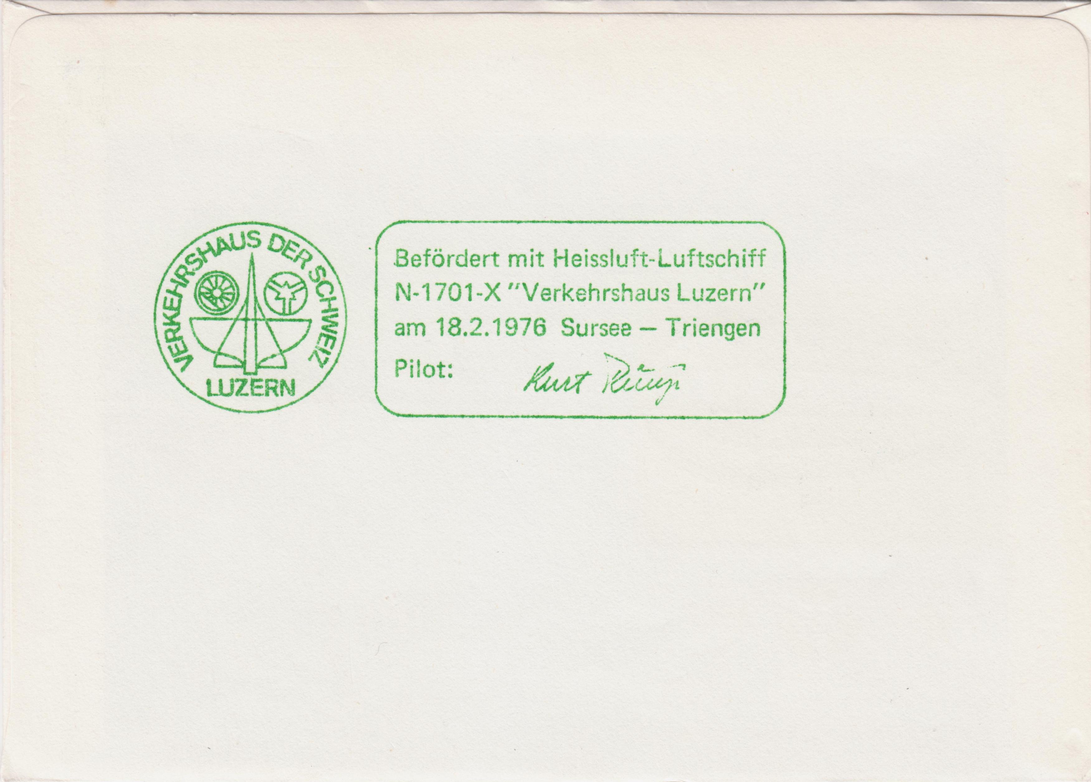 Dieser Beleg wurde am 18.02.1976 in Sursee aufgegeben und laut rückseitigem Bestätigungsstempel in Grün von dort nach ''6234 TRIENGEN'' befördert, wo die Frankatur, ein Viererblock der Schweiz Nr. 1049 am 18.02.1976 um 17 Uhr entwertet wurde.