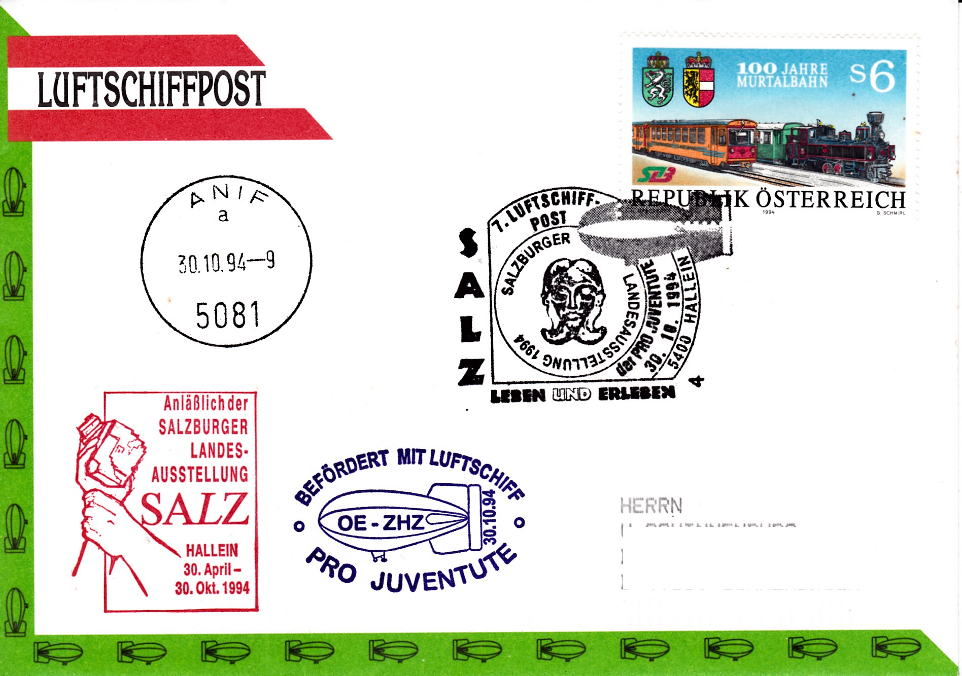 Dieser Beleg dokumentiert am 30.10.1994 per Sonderstempel, Kennziffer 2, 5400 Hallein die mit OE-ZHZ beförderte "7. LUFTSCHIFFPOST der PRO JUVENTUTE'':