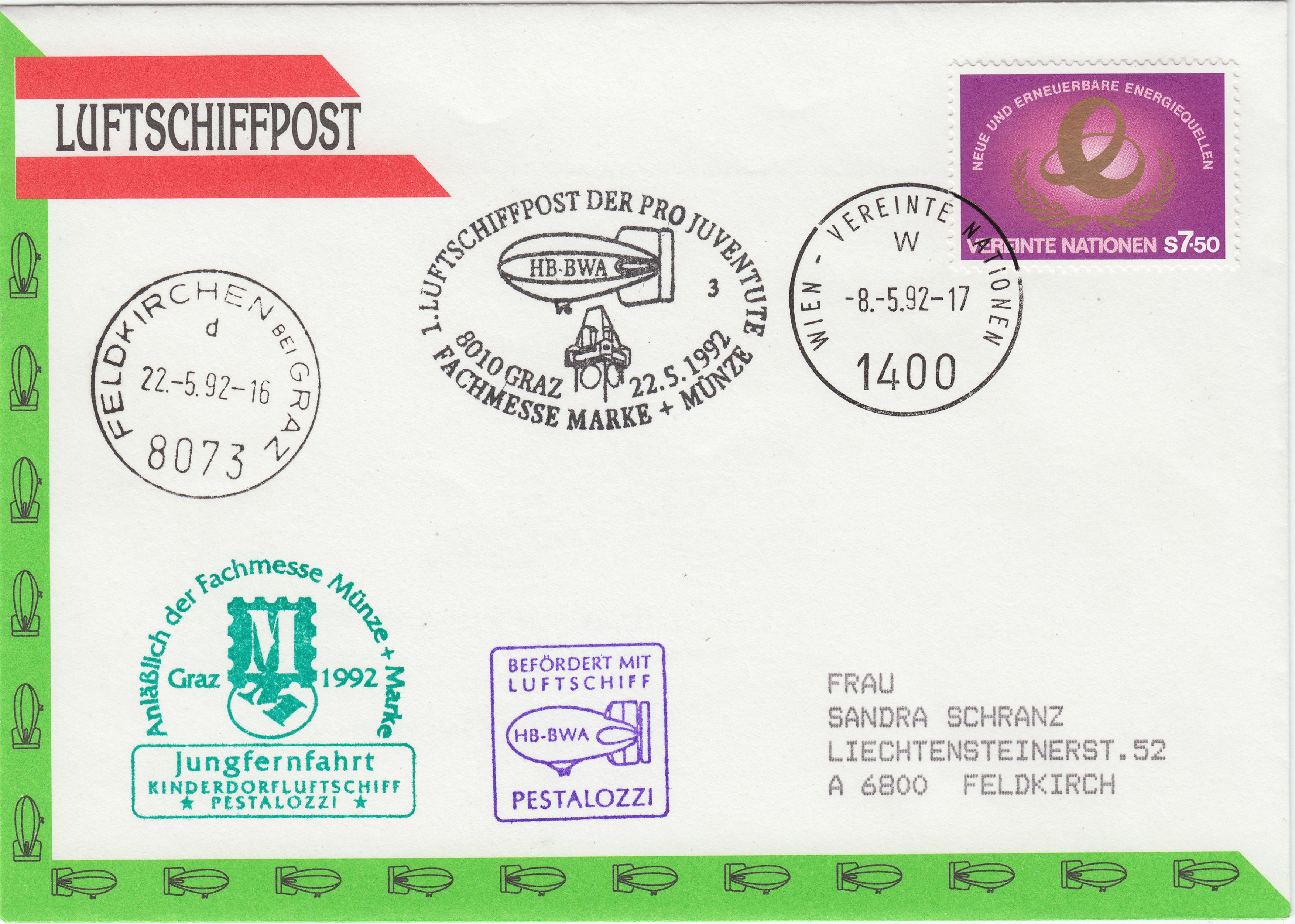Zur Eröffnung der Briefmarkenausstellung im Rang 1 sowie der Fachmesse "Marke & Münze" startete am 22.05.1992 um 7 Uhr früh vom Grazer Messegelände das Luftschiff "PESTALOZZI" zu seiner Jungfernfahrt. In 600 m Höhe fuhr es mit einer Geschwindigkeit von 12 km/h in Richtung Flughafen Graz-Thalerhof. Nach drei Kilometern Fahrt kam der Flughafen in Sicht und das Luftschiff setzte wie vorgesehen auf der Graspiste sanft auf. Leider war die Boden-Crew noch nicht eingetroffen und daher startete das Luftschiff mit Genehmigung des Towers erneut und absolvierte eine "Ehrenrunde" über Abtissendorf. In der Zwischenzeit trafen sowohl das Postfahrzeug als auch die Bodenmannschaft ein und die offizielle Entladung der beförderten Post, 14.200 Belege mit österreichischer Frankatur sowie 18.100 Belege mit UN-Frankatur, erfolgte.