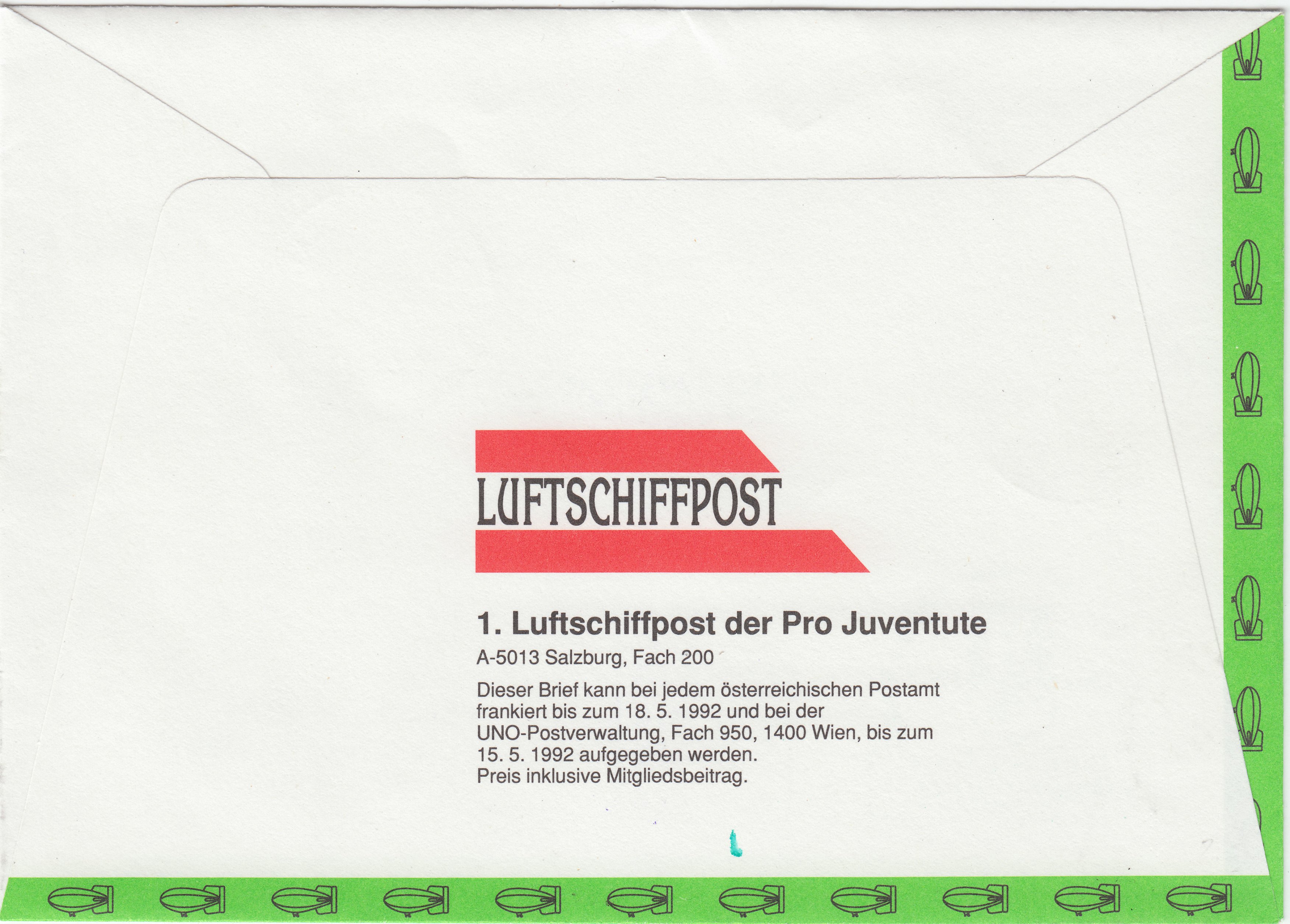 Die ''2. Luftschiffpost der Pro Juventute'' sollte am 06.12.1992 als ''1. NIKOLAUS-LUFTSCHIFFPOST'' vom Sonderpostamt St. Nikola/Pram aus abgeleitet werden.