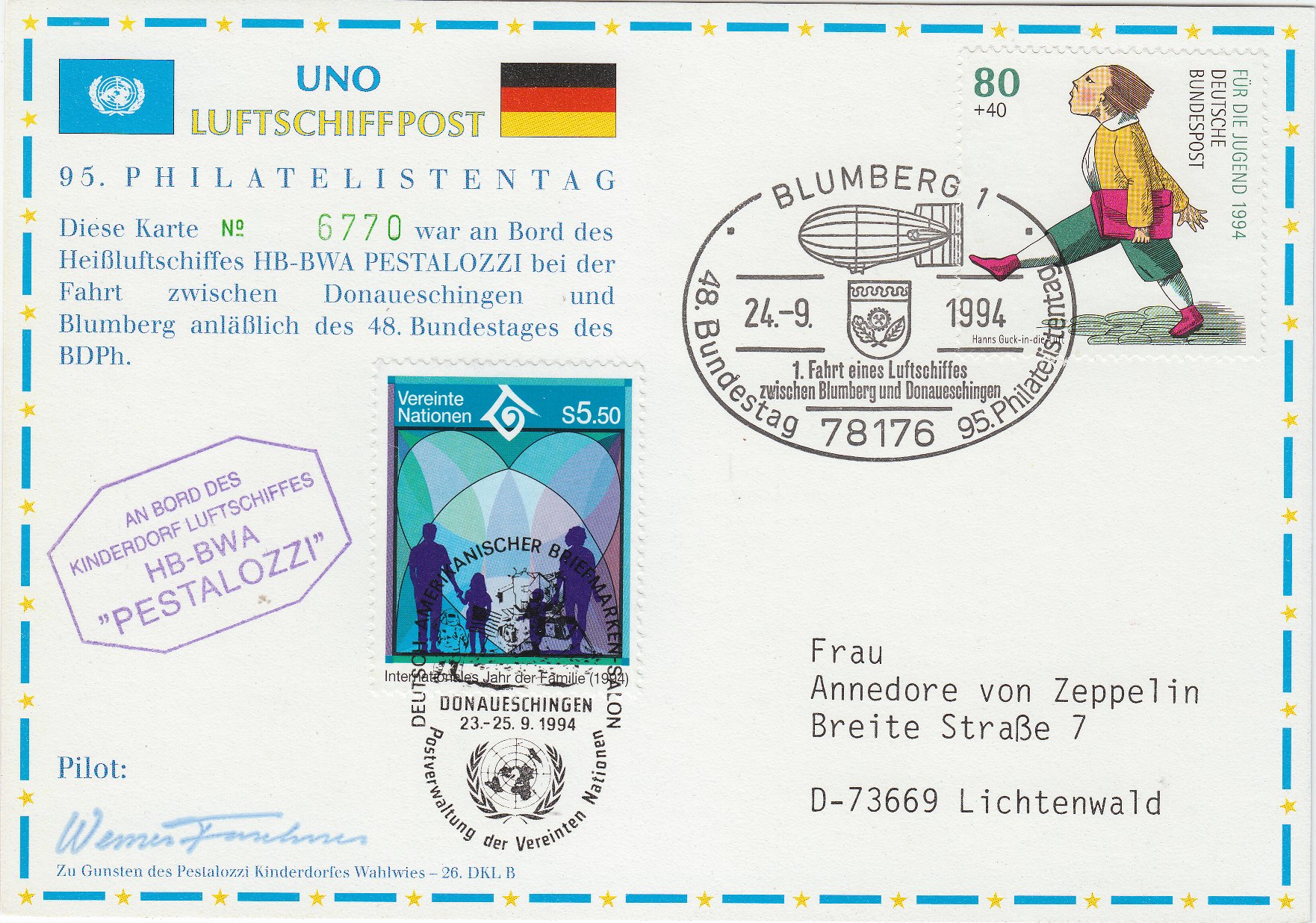 Sie war als Nummer 6770 einer limitierten Auflage an Bord des Heißluftschiffes HB-BWA PESTALOZZI bei der Fahrt zwischen Donaueschingen und Blumberg anläßlich des 48. Bundestages des BDPh. Die Frankatur der Vereinten Nationen wurde daher mit dem Sonderstempel der Vereinten Nationen entwertet.