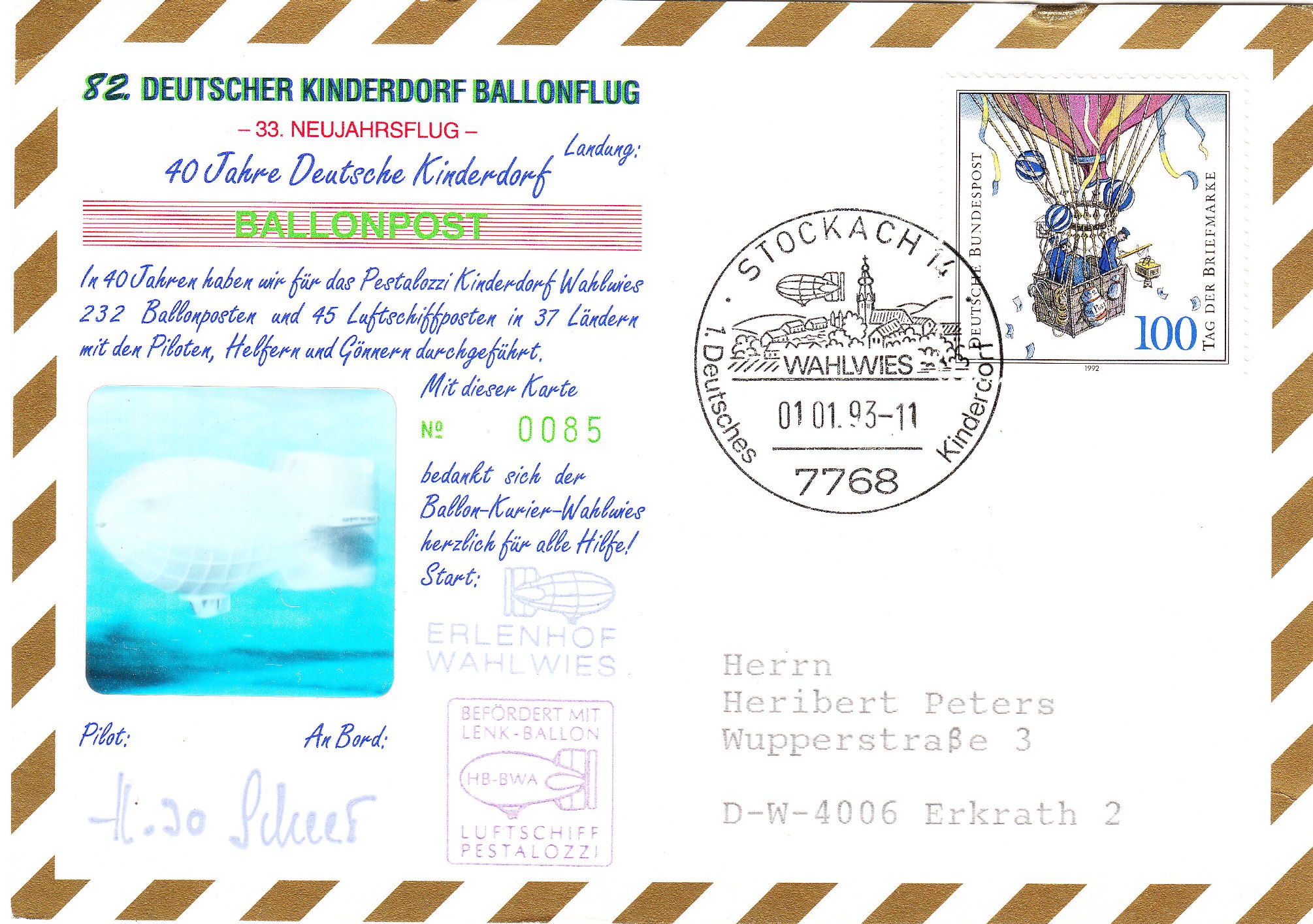 Die Jungfernfahrt von HB-BWA ''PESTALOZZI'' fand am 22.05.1992 in Graz als ''1. Luftschiffpost der Pro Juventute'' statt.