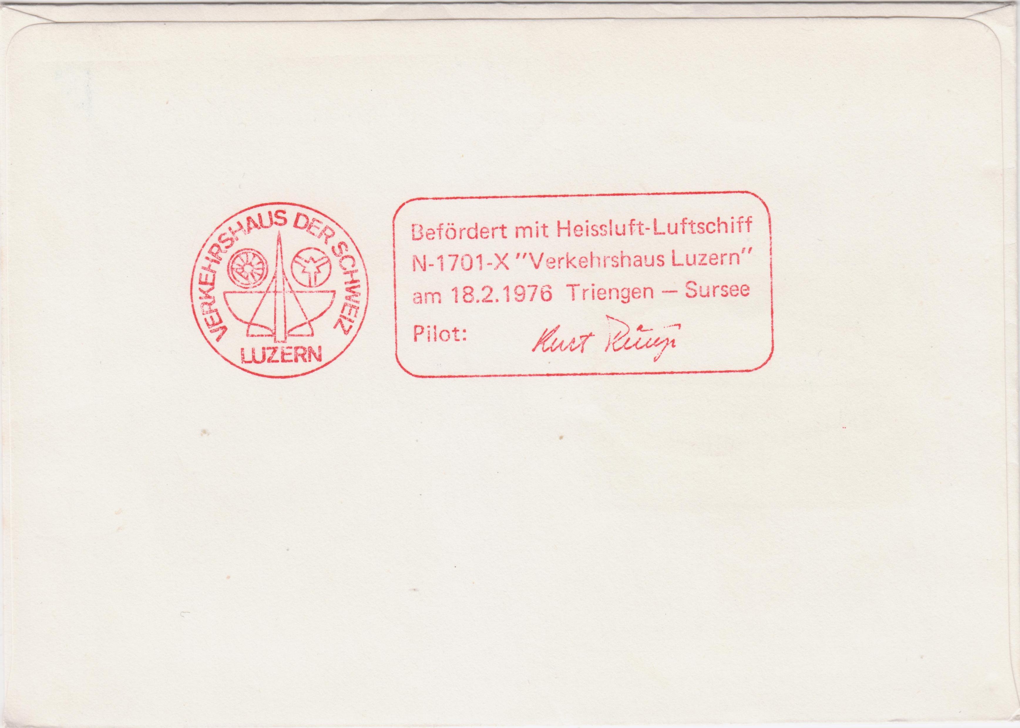 Dieser Beleg wurde am 18.02.1976 in Triengen aufgegeben und laut rückseitigem Bestätigungsstempel in Rot von dort nach ''6210 SURSEE'' befördert, wo die Frankatur, ein Paar der Schweiz Nr. 968 am 18.02.1976 um 16 Uhr entwertet wurde.