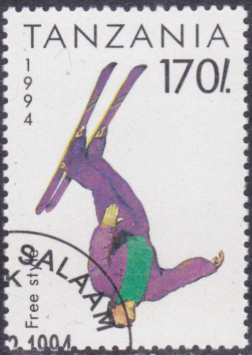 Diese Marke aus Tansania (MiNr 1710) bildet einen Skifahrer beim Springen auf einer Sprungschanze (Aerials) ab.
