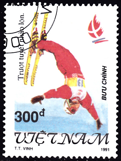 Auf dieser Marke aus Vietnam (MiNr 2353) wird ein Sportler bei Springen auf einer Sprungschanze (Aerials) gezeigt.