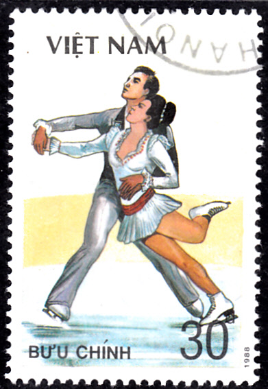 Aus Vietnam kommt diese Marke (MiNr 2044) aus einer Serie "Eistanzen" mit einem Eistanzpaar bei einer Hebefigur.