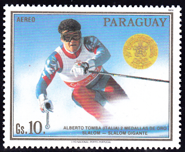 In der Serie aus Paraguay gibt es auch eine Marke (MiNr 4263) zu seinen zwei Siegen im Riesenslalom und Slalom.