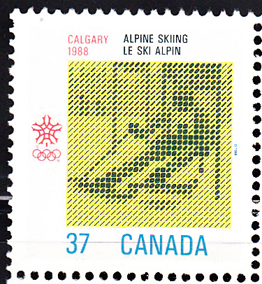 Auf dieser Marke aus Kanada (MiNr 1075) zu den Olympischen Spielen in Calgary 1988 ist bei genauer Betrachtung ein Skifahrer beim Riesenslalom zu erkennen.