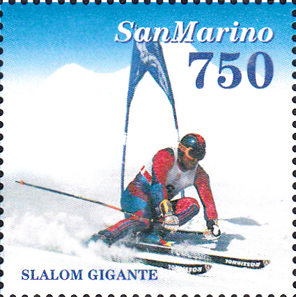 Diese Marke aus San Marino zu den Olympischen Winterspielen 1994 (MiNr 1566) zeigt einen Skifahrer beim Riesenslalom.
