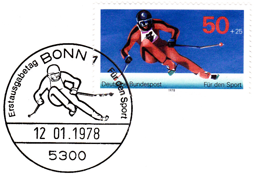 Auf der Zuschlagsmarke der Deutschen Bundespost für die Sporthilfe 1978 zu 50+25PF (MiNr 958) wird ein Abfahrtsläufer gezeigt. Hier eine Marke, die mit dem zum Motiv passenden Ersttagsonderstempel Bonn abgestempelt ist.
