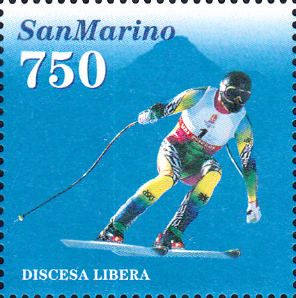 Marke aus San Marino zu den Olympischen Winterspielen 1994 (MiNr 1565) mit einem Abfahrtsläufer im Markenbild.