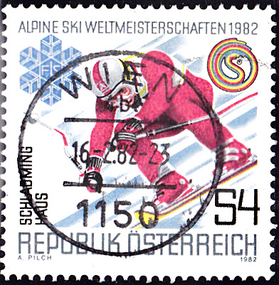 Diese Marke aus Österreich zu den Alpinen Skiweltmeisterschaften 1982 (MiNr 1695) zeigt einen Abfahrtsläufer.