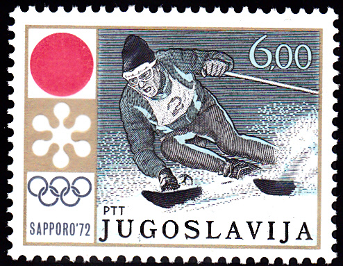 Aus Jugoslawien kommt diese Marke (MiNr 1448) zu den Spielen in Sapporo mit einem Abfahrtsläufer.