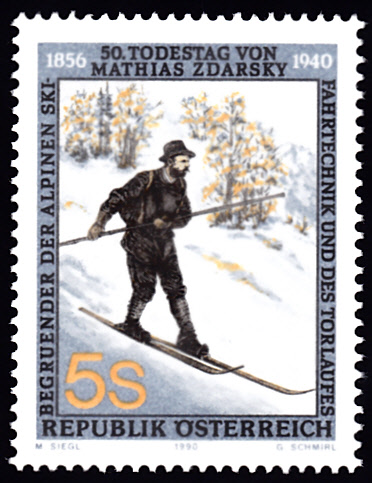 Zum 50. Todestag von Matthias Zdarsky ist in Österreich eine Marke (MiNr 1998) erschienen. Die Marke zeigt Mathias Zdarsky bei der Präsentation seiner alpinen Skilauftechnik im Jahre 1905.