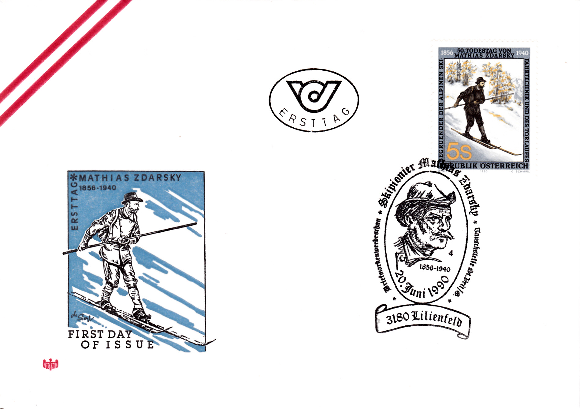 Im Sonderstempel aus Lilienfeld auf diesem FDC ist ein Porträt von Mathias Zdarsky als Motiv verwendet worden.