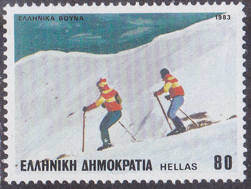 Skifahren ist für viele eine Freizeitsportart. Diese Marke aus Griechenland (MiNr 1519) zeigt zwei Freizeitsportler beim Skifahren.
