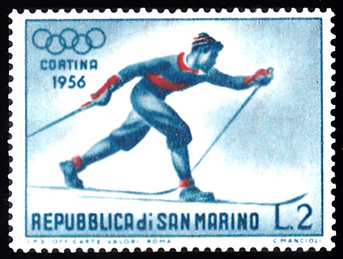 In San Marino ist in der Serie zu den Spielen in Cortina d'Ampezzo auch diese Marke (MiNr 536) mit einem Skilangläufer erschienen.