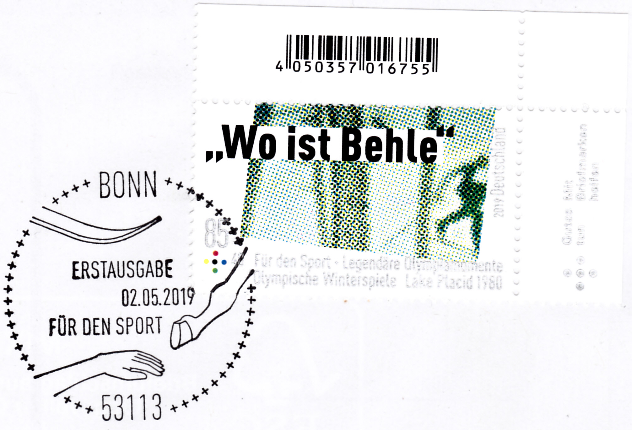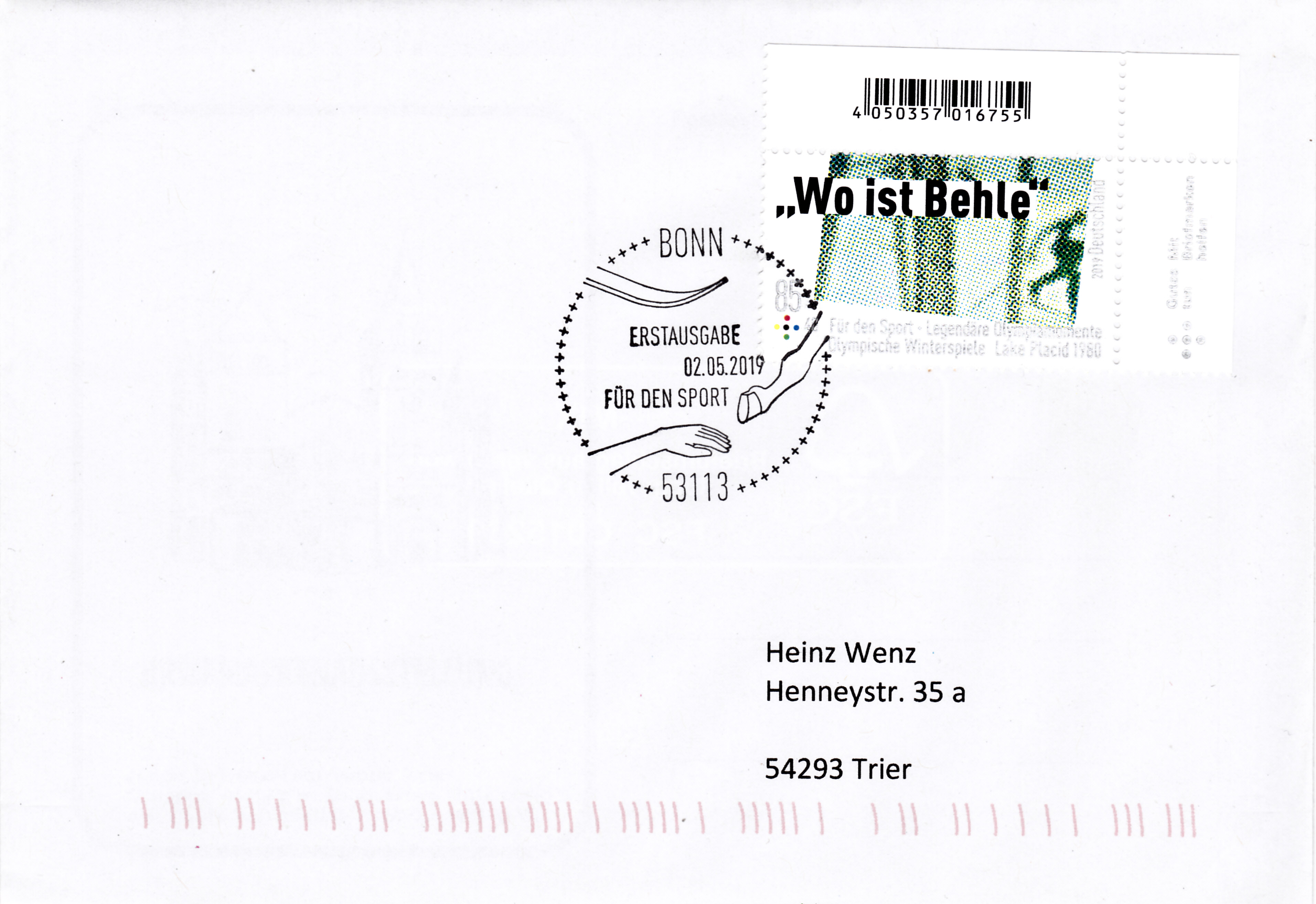 Klappkarte des Vorstandsvorsitzenden der Deutschen Post AG mit den drei Marken "Für den Sport" 2019 (MiNr 3460 bis 3462) mit Motiven zu "Legendären Olympiamomente" und dem Ersttagsonderstempel Bonn.