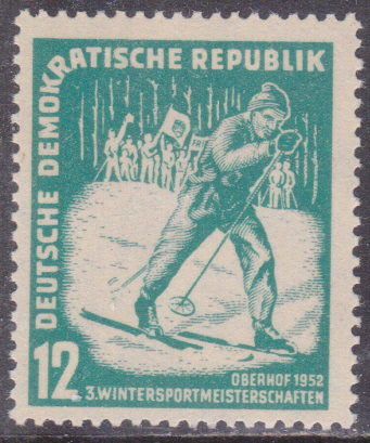 Zu den Wintersportmeisterschaften der DDR 1952 in Oberhof ist in der DDR diese Marke (MiNr 298) mit einem Skilangläufer erschienen.