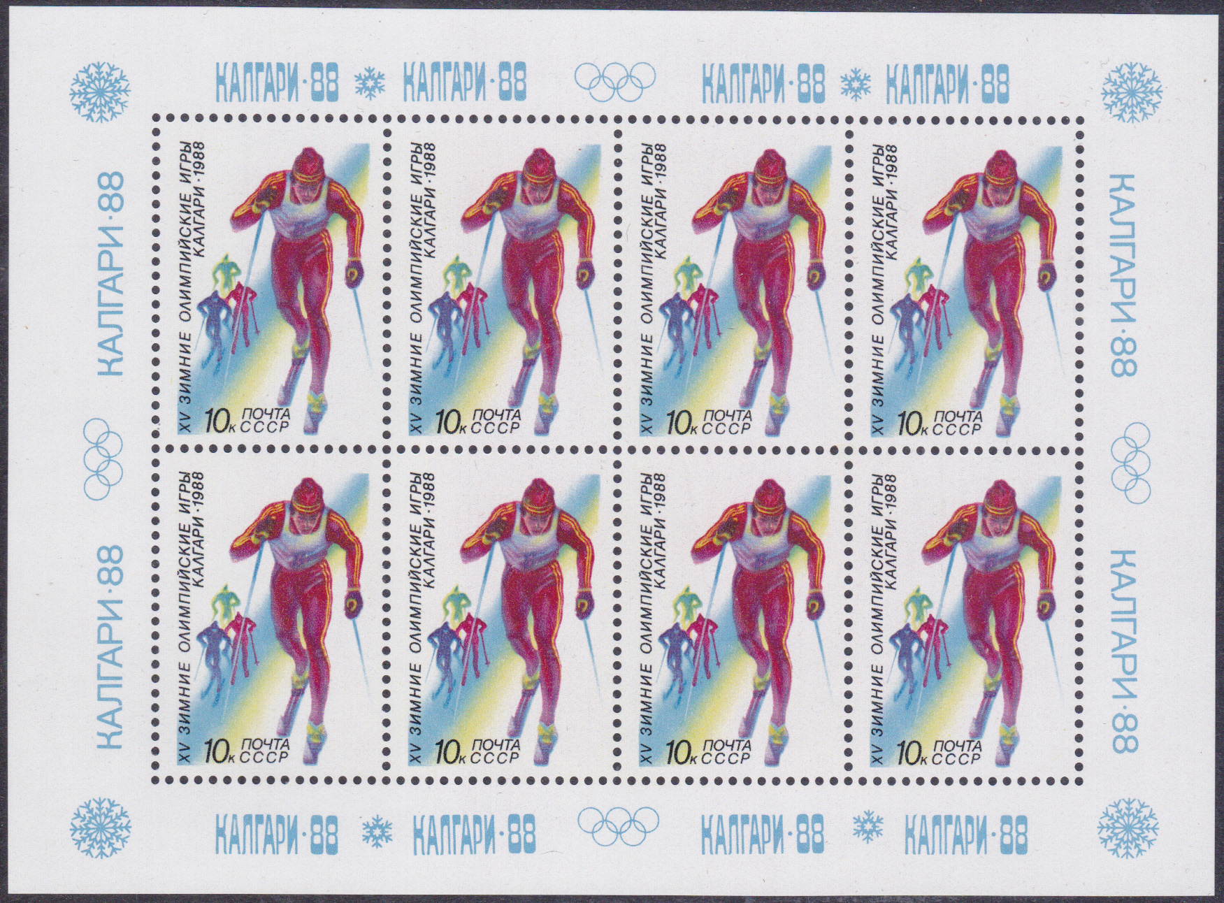 In einer Serie zu den Spielen in Calgary erschien eine Marke zu 10 Kopeken (MiNr 5789) mit einem Langläufer. Die Marke wurde in Bögen zu 50 Marken und im Kleinbogen zu 8 Marken gedruckt. Hier zeige ich den selteneren Kleinbogen.