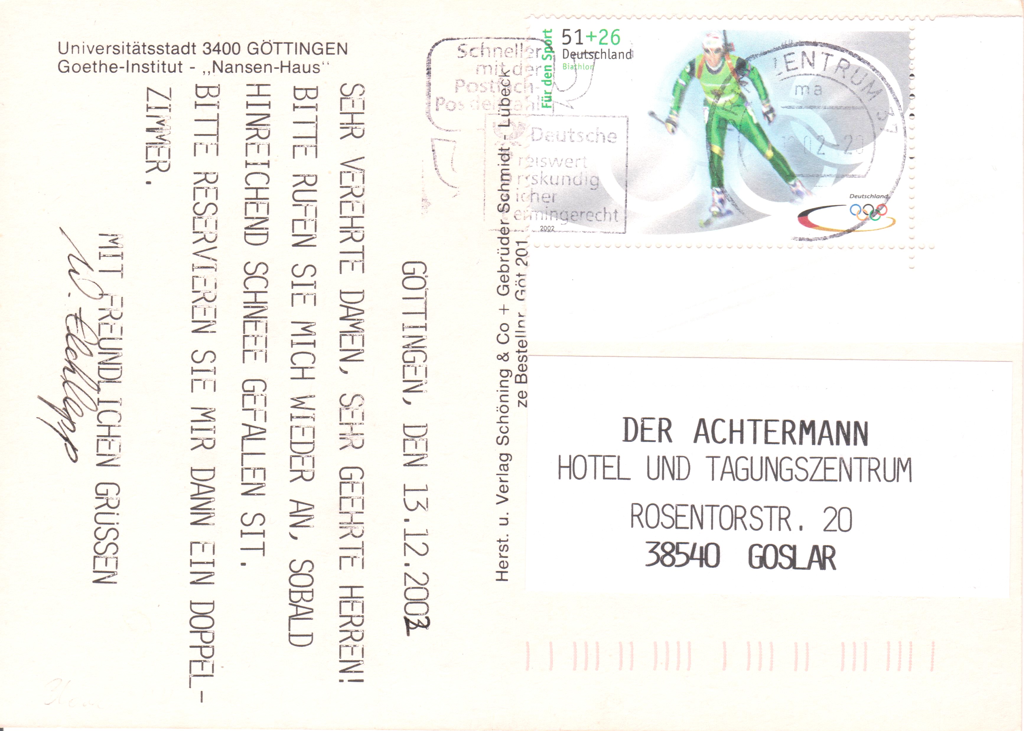 Portogerechte Einzelfrankatur Bund MiNr. 2237 a, olympische Winterspiele Biathlon aus Kleinbogen (5x2), Rand durchgezähnt, auf Postkarte: