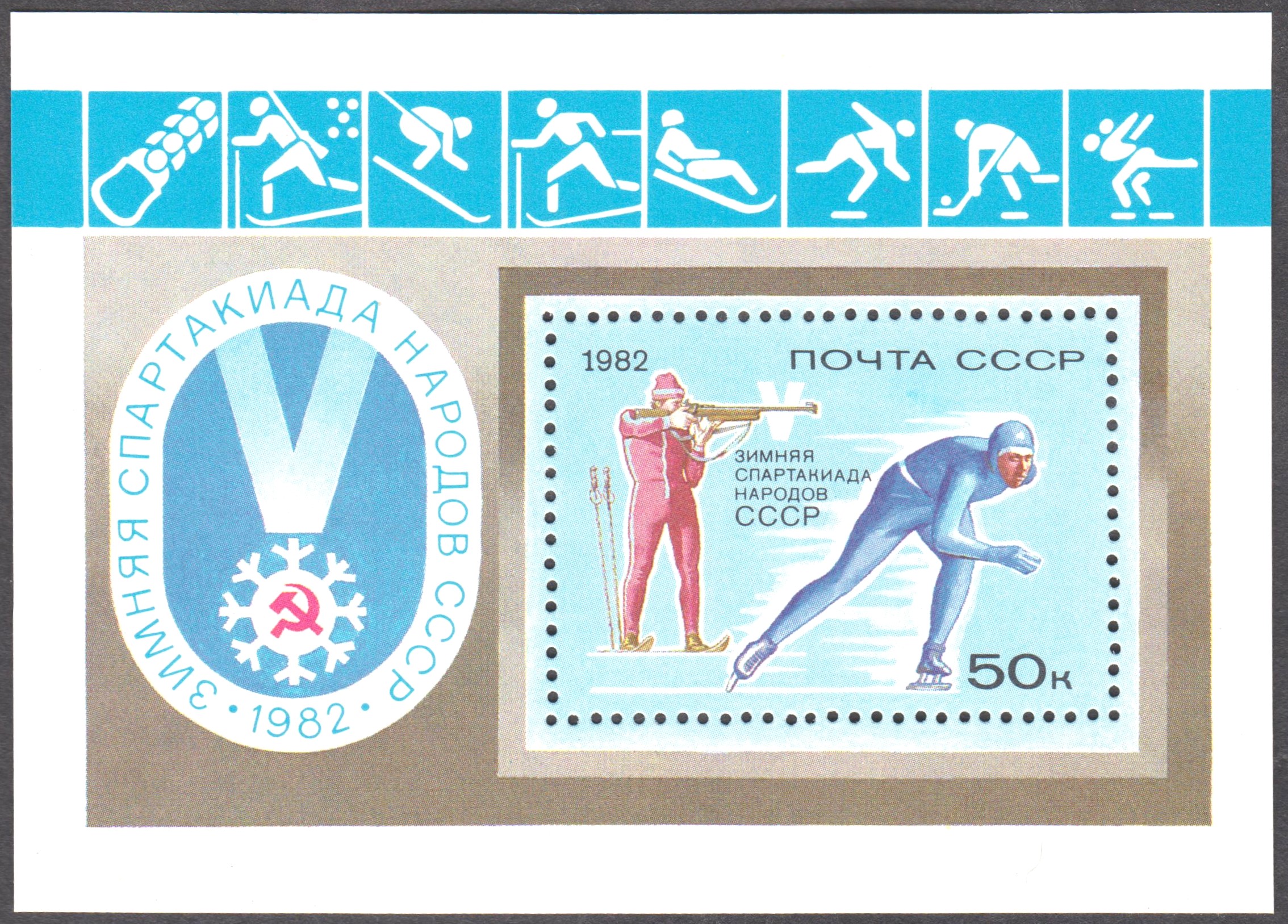 Dieser Block aus der Sowjetunion zeigt im eingedruckten Postwertzeichen einen Biathleten beim Stehendschießen sowie im oberen Blockrand ein Piktogramm mit einem Biathleten beim Skilanglauf: