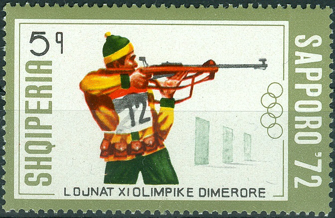 Das Stehendschießen ist das Biathlon-Motiv auf dieser albanischen Marke aus dem Jahr 1972 (MiNr. 1527).