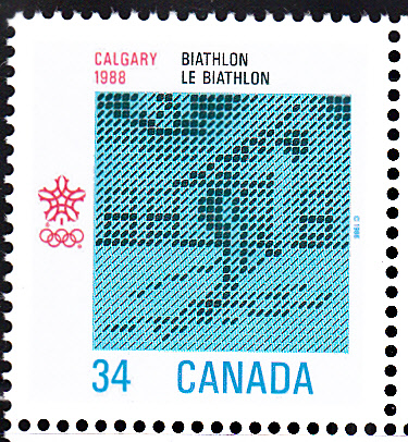 Auf dieser Marke aus Kanada (MiNr 1011) zu den Olympischen Spielen in Calgary 1988 ist bei genauer Betrachtung ein Biathlet zu erkennen.
