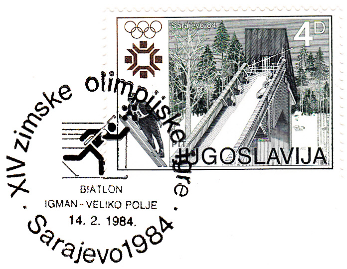 Sonderstempel aus Sarajewo vom 14.2.1984 zu dem Olympischen Biathlonwettbewerb über 10 Km vom gleichen Tag mit der Abbildung eines Biathleten beim Skilaufen im Stempelbild.