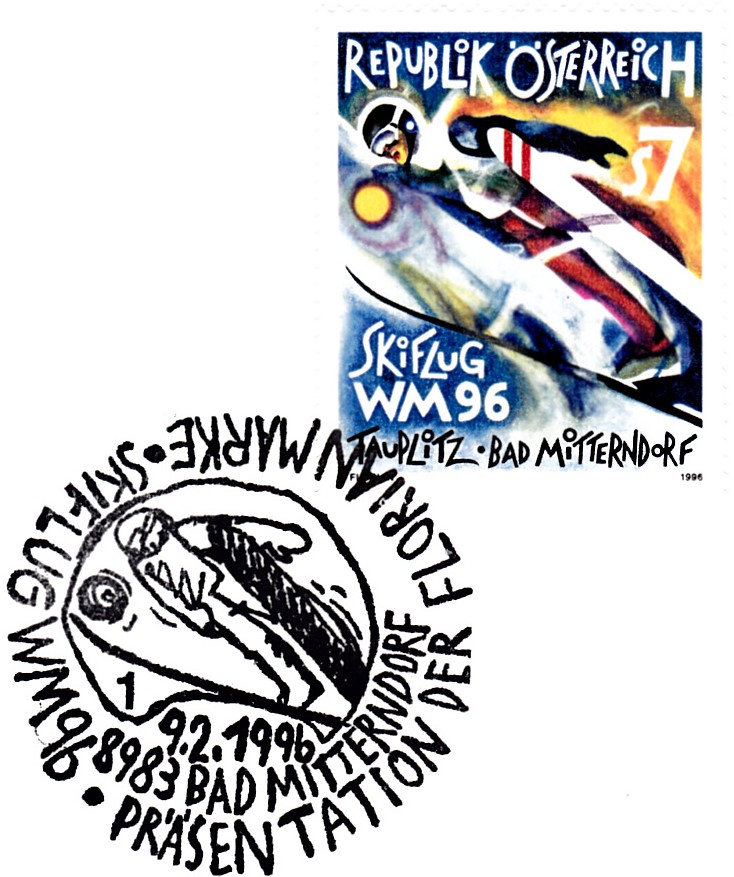 FDC mit der bereits gezeigten Marke aus Österreich zur WM im Skifliegen 1996 in Tauplitz/Bad Mitterndorf auf der Schanze am Kulm mit dem Sonderstempel aus Bad Mitterndorf mit der Kennziffer "1".
