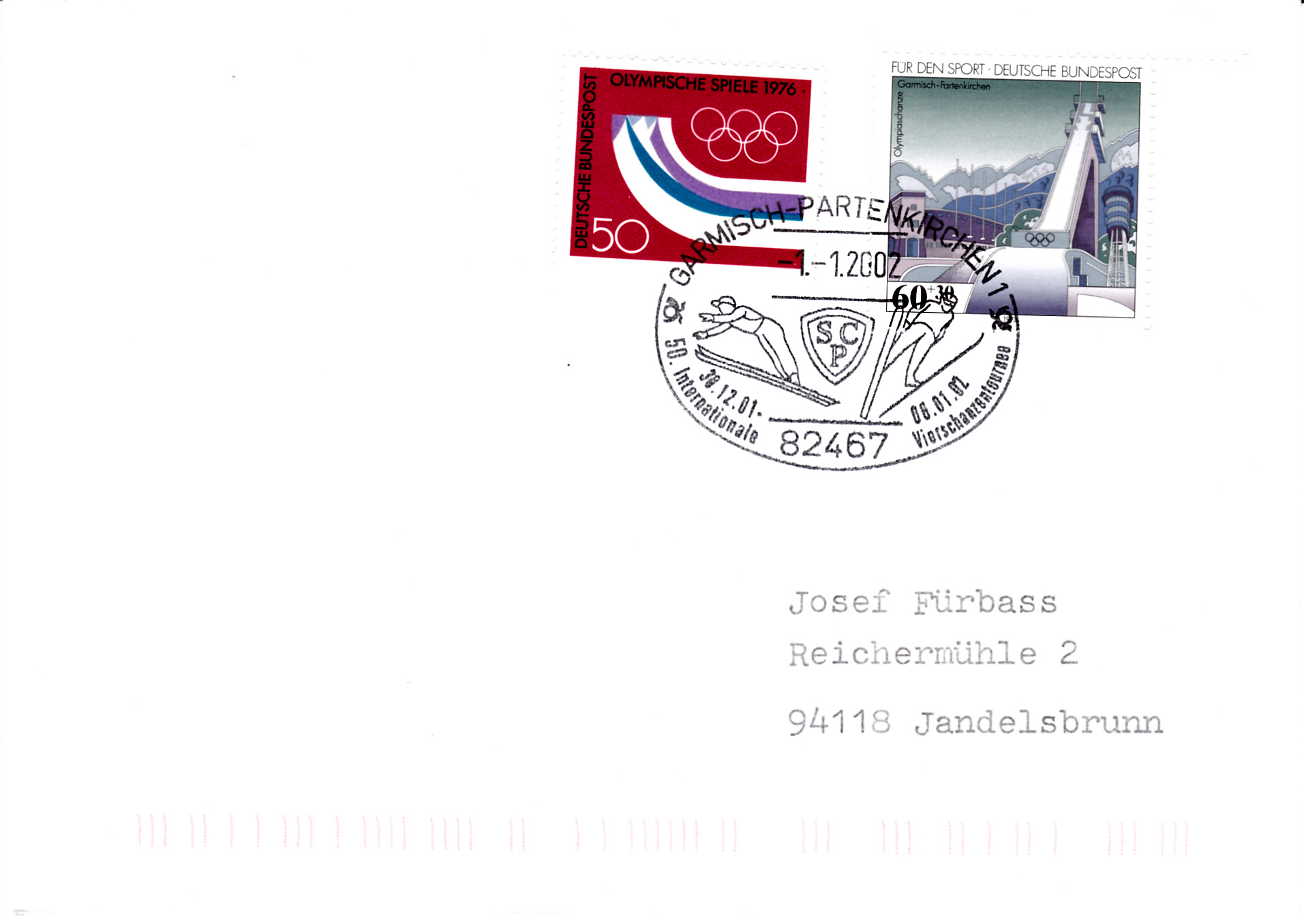 Hier kann ich einen weiteren Sonderstempel aus Garmisch-Partenkirchen zeigen. Er wurde am 1.1.2000 zum Springen bei der Vierschanzentournee 1999/2000 eingesetzt.