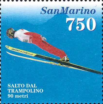 Marke aus San Marino zu den Olympischen Winterspielen 1994 (MiNr 1564) mit einem Skispringer laut Beschriftung auf der Marke von einer sogenannten "Normalschanze" (hier K-Punkt 90m).