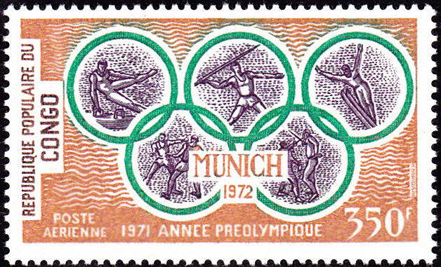 Diese Marke aus Kongo-Brazzaville (MiNr 313) zeigt in einem der Olympischen Ringe auch einen Skispringer, der allerdings auf einer Ausgabe zu den Sommerspielen in München fehl am Platz ist.