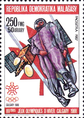 Diese Marke (MiNr 1067 A) aus einer Serie aus Madagaskar zu den Winterspielen in Calgary zeigt einen Einsitzer beim Rodeln.