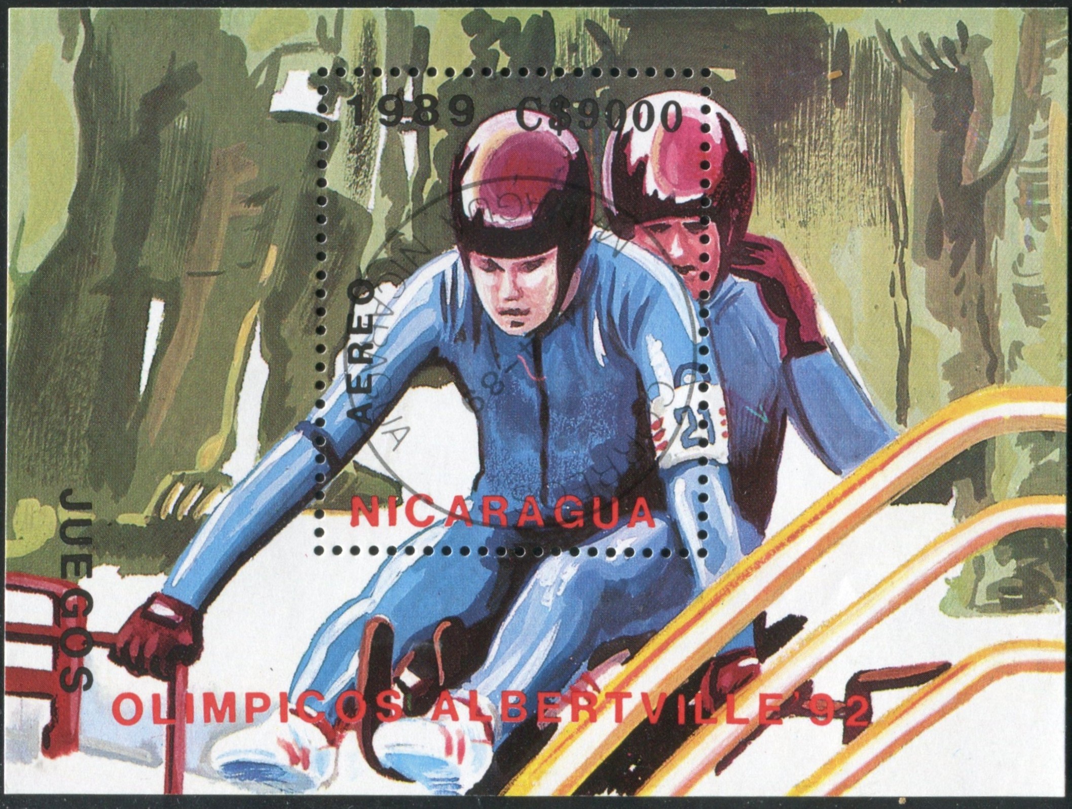 Dieser Block aus Nicaragua zeigt den Start eines Doppelsitzers bei den Olympischen Spielen 1992 in Albertville: