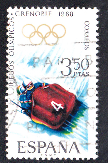 Auch bei dieser zu den Olympischen Winterspiele in Grenoble in Spanien erschienenen Marke (MiNr 1736) mit einer Abbildung zum Bobfahren ist der vierte Bobfahrer hinter dem dritten Mann versteckt und täuscht so einen "Dreierbob" vor.