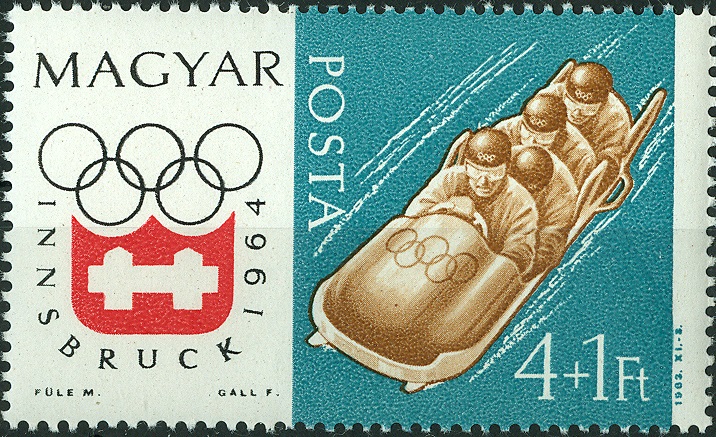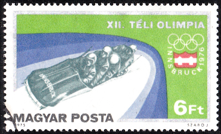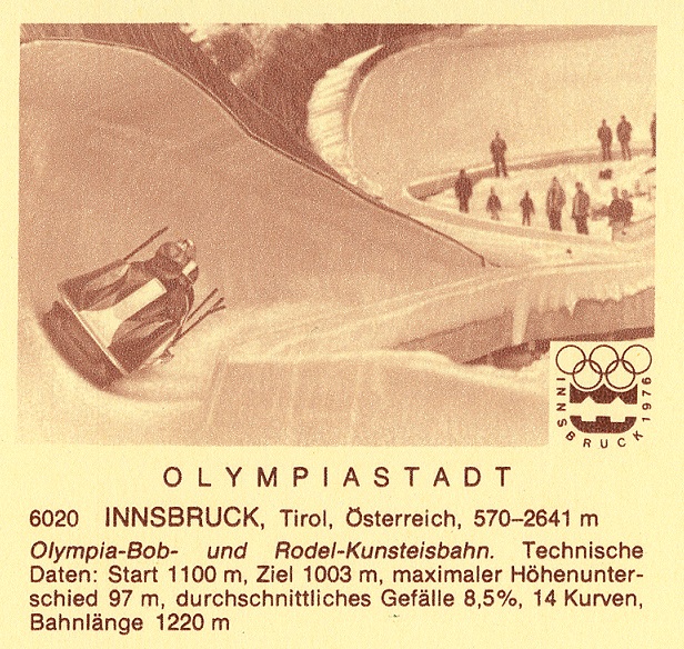 Diese Postkarte zu den Olympischen Winterspielen in Innsbruck 1976 macht mit der Bob-Bahn bekannt. Da mehr als 2 Helme zu sehen sind, stelle ich das Motiv "vorsichtshalber" in das Viererbob-Thema.