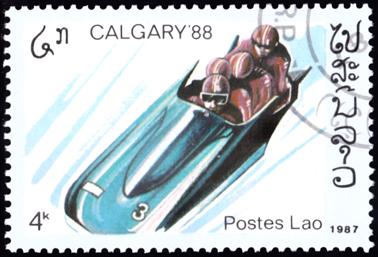 Eine Marke aus Laos (MiNr 969) zu den Winterspielen 1988 in Calgary zeigt einen Viererbob.