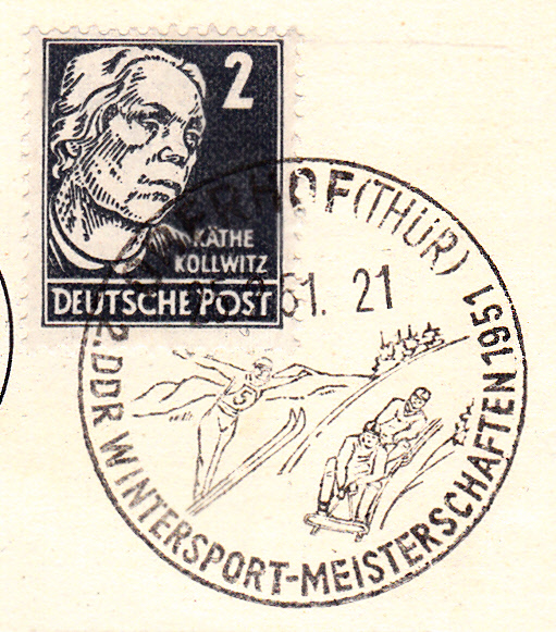Sonderstempel vom 25.2.1951 aus Oberhof zu den 2. Wintersport-Meisterschaften der DDR mit der Abbildung eines Skispringers und einem Zweierbob.